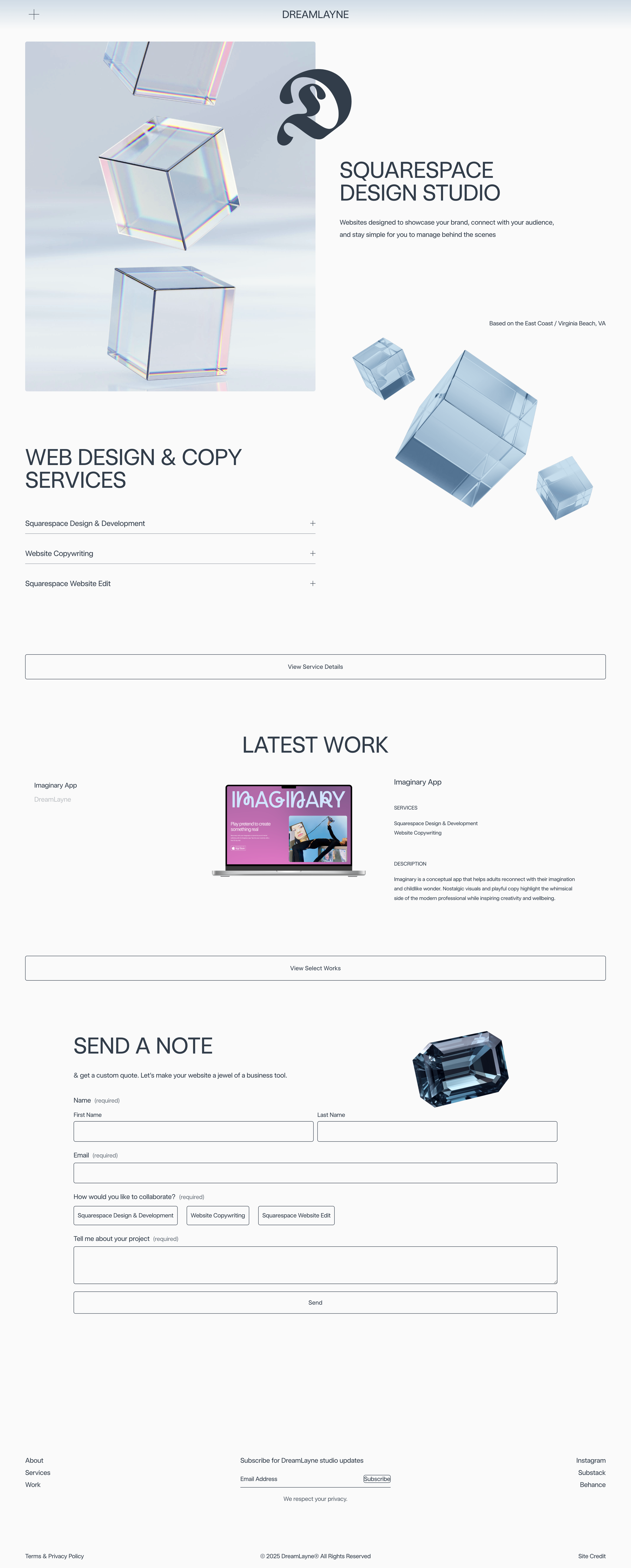 This project was a unique one because I was the client. The site you’re experiencing now was created with the same DreamLayne approach I bring to every project: a blend of creativity and strategy. Through Squarespace design and copywriting, I shaped a space that feels clear, layered, and intentional—leaving room for my brand to breathe.